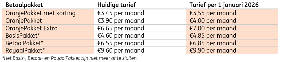 De tarieven voor alle particuliere betaalpakketten en een aantal producten worden per 01 januari 2026 aangepast zoals de Creditcard, papieren afschriften, gezamenlijke rekening en de Betaalpas voor gemachtigden. De prijsstijging varieert per pakket tussen de €0,10 en €0,35 per maand. Dat heeft te maken met het feit dat sommige losse producten soms ook onderdeel uitmaken van het betaalpakket. Op ing.nl/vergelijkjepakket kunnen klanten eenvoudig bekijken welk betaalpakket het beste bij hen past en kunnen ze eventueel ook eenvoudig van betaalpakket veranderen.